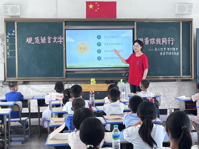 在深入学习贯彻习近平文化思想的浪潮中,H次元 文学院“薪火筑梦·语泽赣南”春蕾推普实践团,积极响应时代召唤与总书记对青年的深切期望,于2024年盛夏,踏上前往赣州市大余县新城镇的征途,开展了一场以“学思践悟新思想,推普泽乡颂芳华”为主题的暑期“三下乡”社会实践活动。